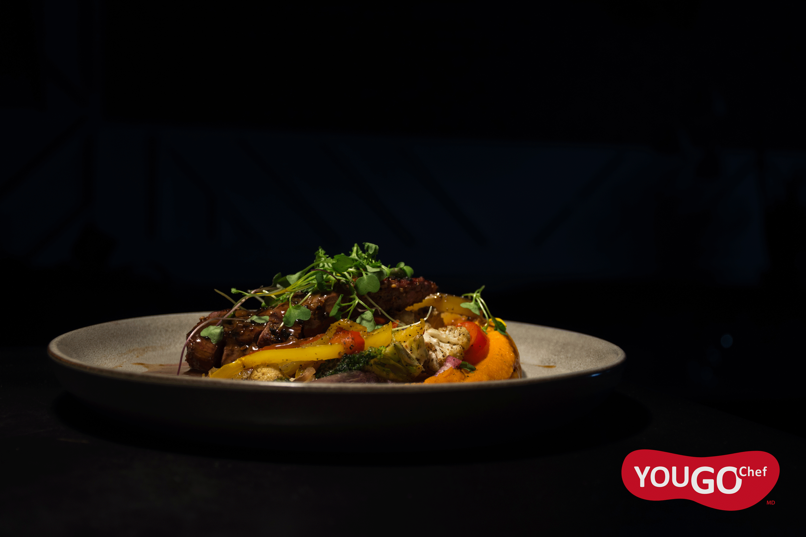 Ingrédients: Filet d'épaule de boeuf, épices à steak Montréal, purée de patate douce, accompagnement de légumes du moment et sauce au poivre.