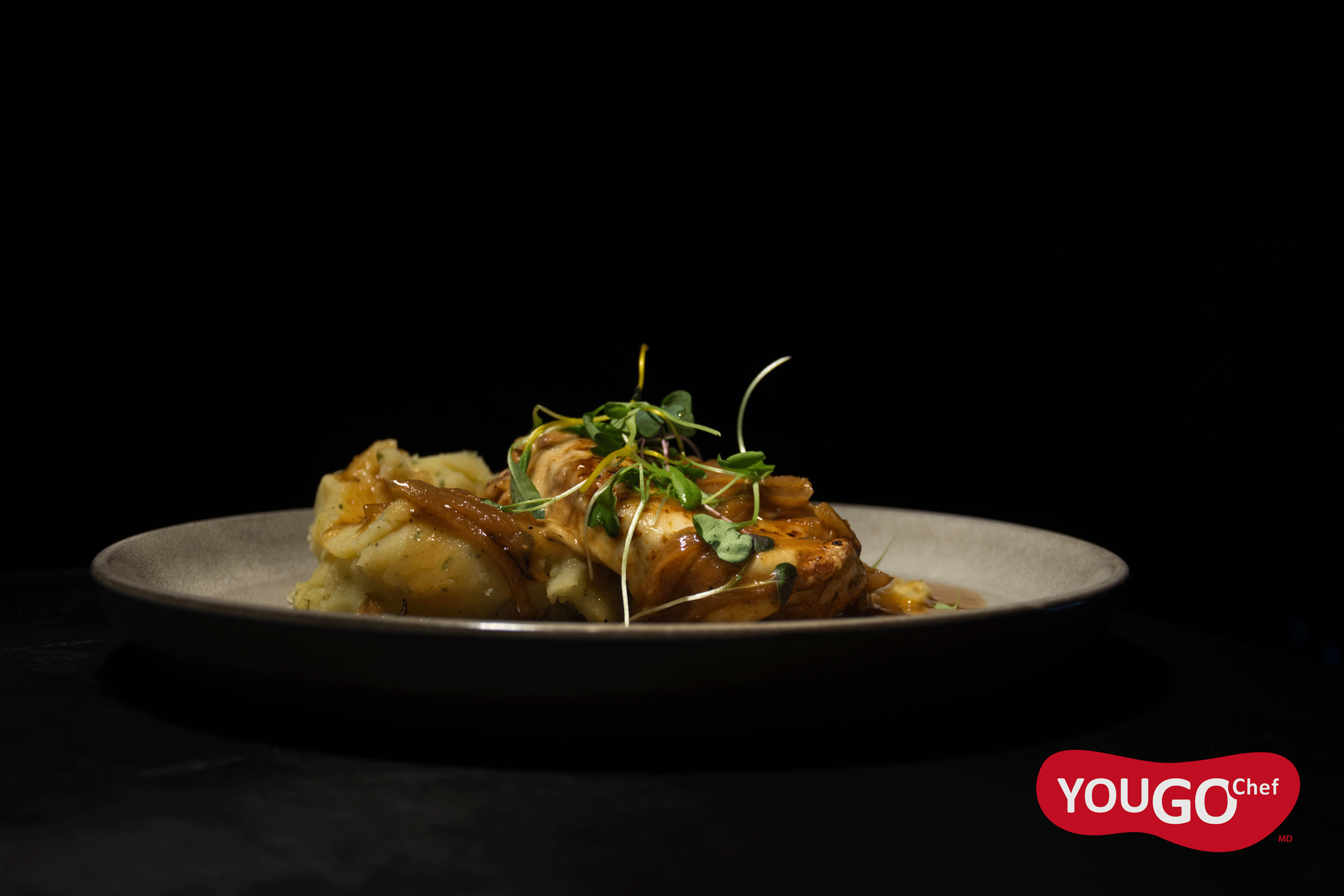 Ingrédients: Haut de cuisse de poulet, oignon espagnol, purée de pomme de terre, thym, ail, sauce demi-glace, moutarde de dijon, sauce worcestershire, beurre, eau, sel et poivre.