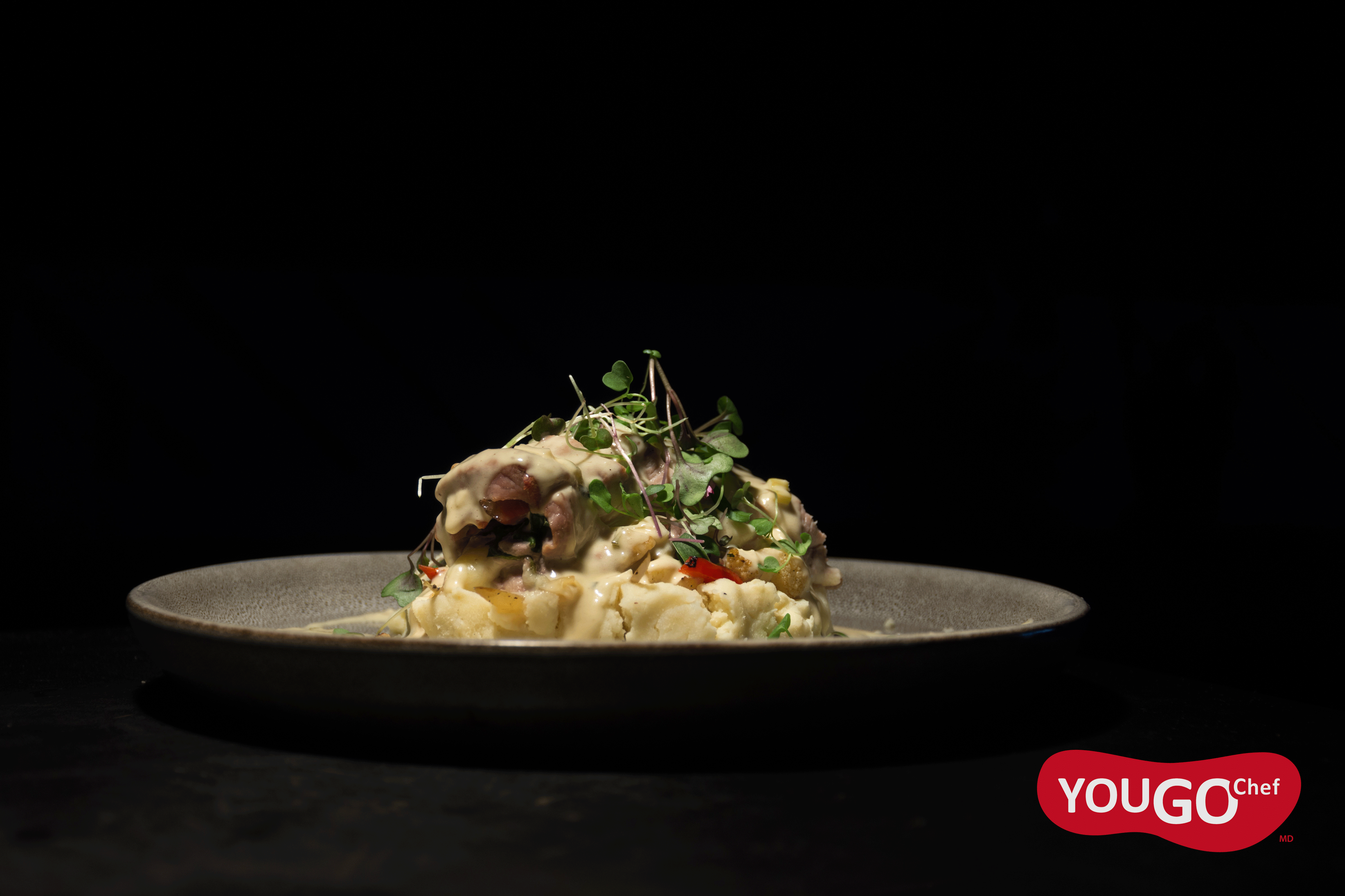 Ingredients: Filet de porc, gouda fumé, épinards, pancetta, accompagnement de légumes, purée de pomme de terre, crème de cuisson 35%, oignon espagnol, échalote verte, ail, vin blanc de cuisson, moutarde de dijon, fécule de maïs, sel et poivre.