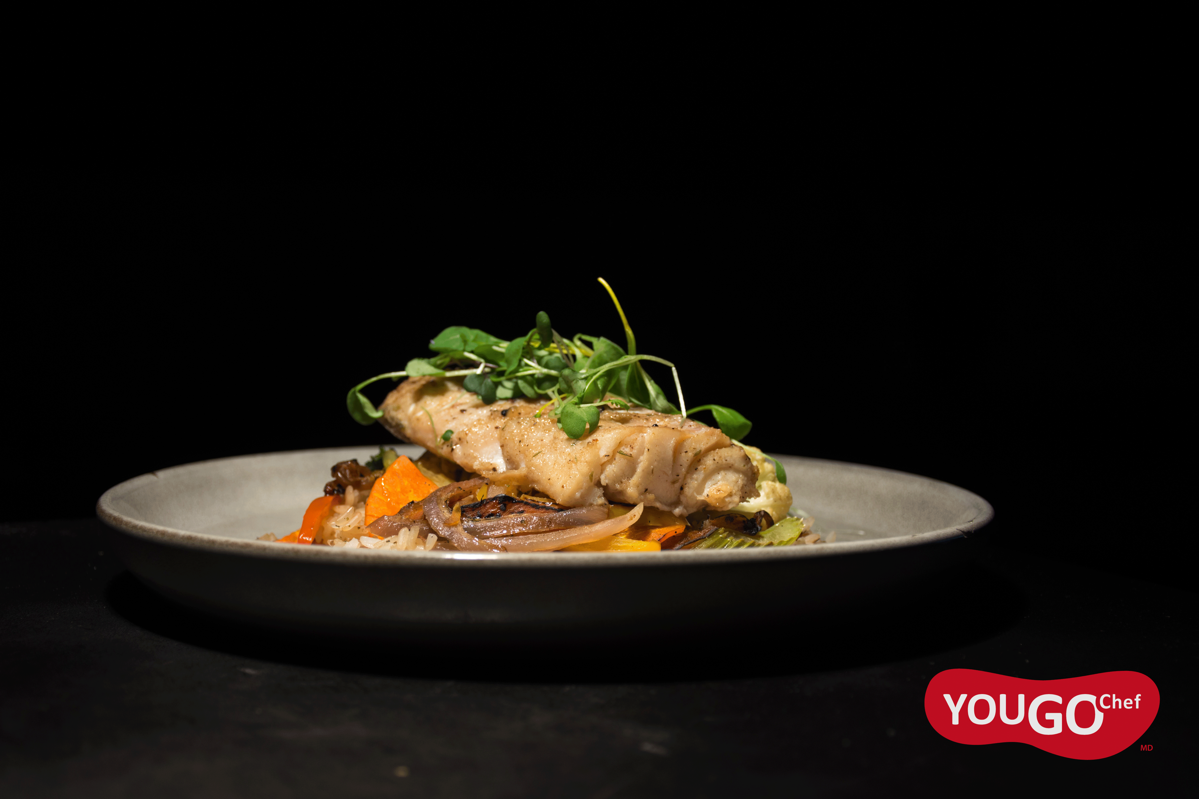 Ingrédients: Morue fraîche, riz sauvage, accompagnement de légumes, huile canola, cumin, piment jamaïque, poudre d'oignon, poudre d'ail, jus de citron, sel et poivre.