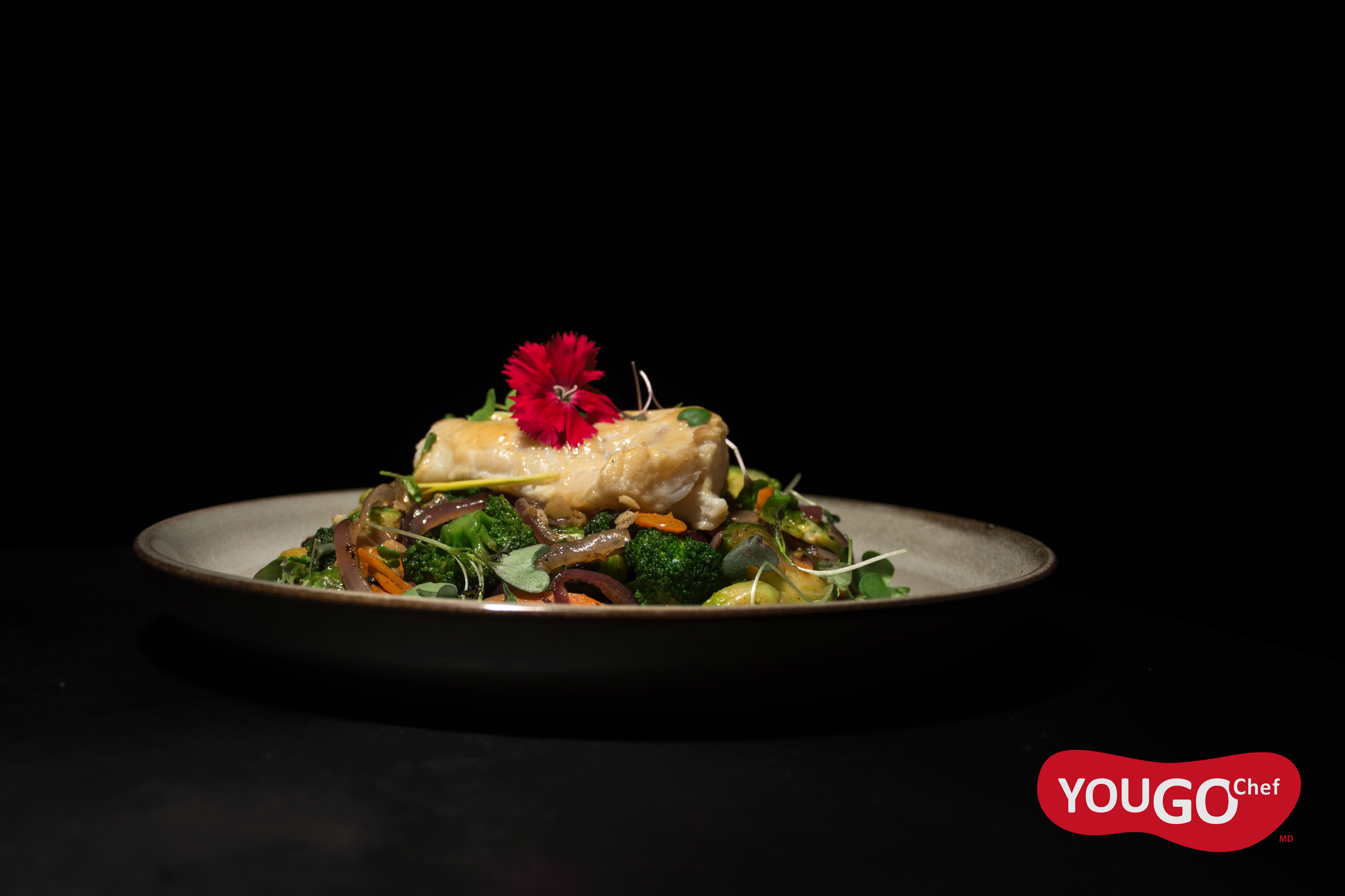 Morue sauvage poêlée à l'huile servie avec une sauce style tzatziki sur couscous israélien aux légumes.